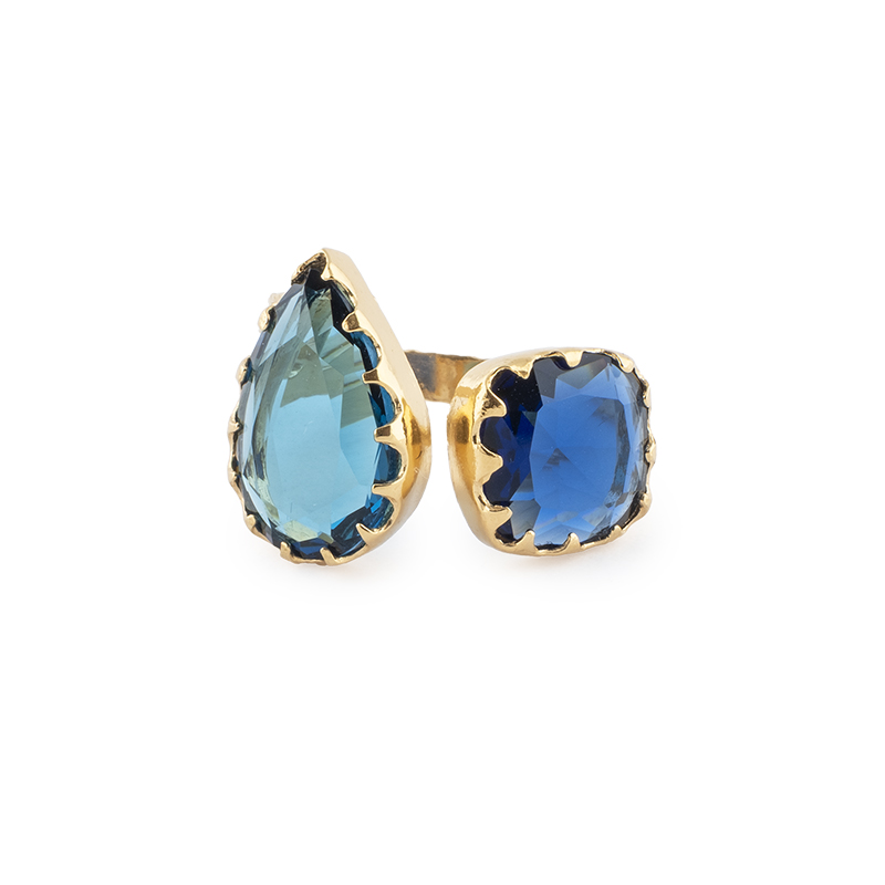 Anel ajustável , em prata 925 plaqueado ouro 24k com 2 cristais