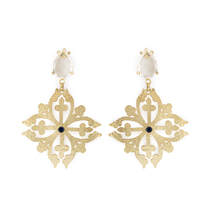 Brincos em prata dourada com 1 cristal branco em formato gota e um mini cristal azul safira
