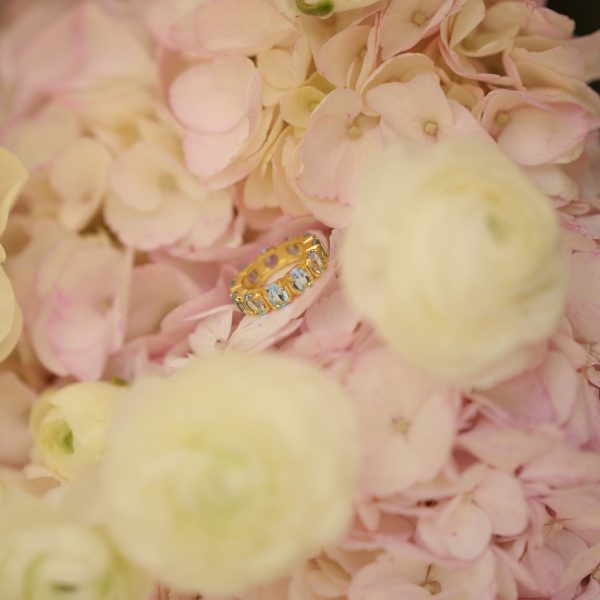 Anel em prata dourada e cristais azul topázio (Daisy Collection)
